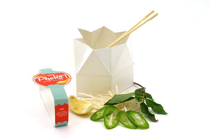 The pho kit template is a custom design built for shipping and waste minimization. The star bowl collapse to add twice the amount of shipping space compared to competing microwave noodle bowls. The folding lid also allows for saving left over pho if the meal is not finished.